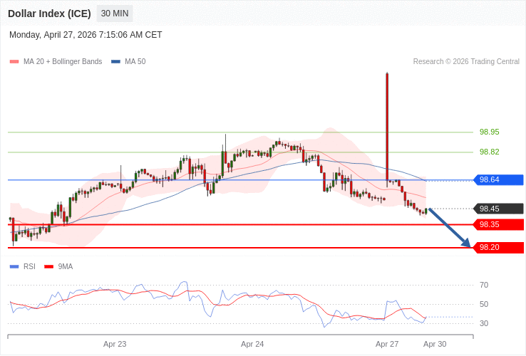 Komentář: Průraz pod hladinu 98,35 by mohl vyvolat pokles směrem k 98,20.