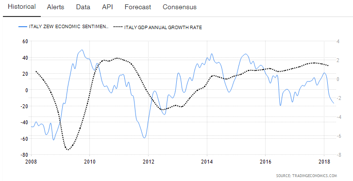 ZEW ukazuje taktiež na spomalenie Talianskej ekonomiky v budúcnosti. V grafe vidíme porovnanie s medziročným rastom HDP. ZEW je tak predstihovým indikátorom v tomto smere.