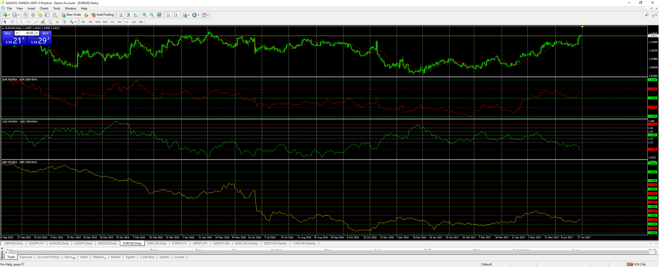 Na prilozenem obrazku je vydet vyvoj tri men po dobu 2 let na grafu EUR/USD. Prvni indikator znazornuje vyvoj EURa cervena krivka, druhy indikator znazornuje USD zelena krivka a treti indikator znazornuje GBP zluta krivka. Zelene linky znazornuji urovne po 600 pipech (jsou totozne jako sloupcovy graf na dexcelu) a cervene ohranicuji prostor techto urovni.