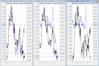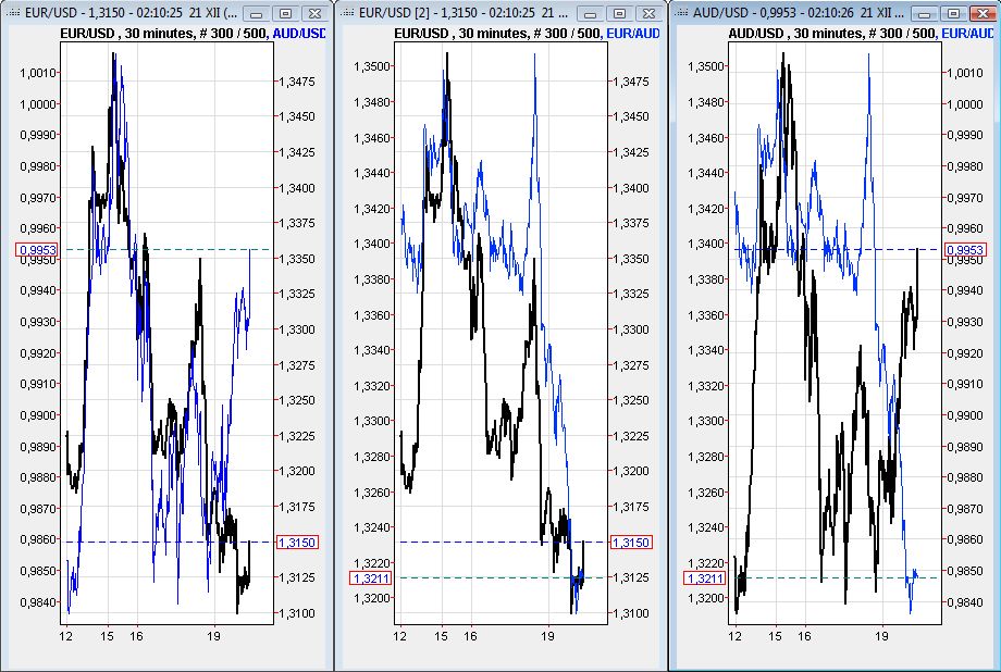 Když se vrátím na začátek k dotazům, tak pokud jsem popis indikace z došlých mailů dobře pochopil, tyto "pseudo" SOK indikace řeší výhradně vztahy uvnitř nějaké dané trojice párů. K těmto vztahům existuje v prostředí MT4 už dobrých 5-6 let hafo indikací a tedy nic nového pod sluncem. Rozpitvání uzavřené trojice na dvojice párů je sice přehlednější pro orientaci, ale nic moc nám nenapoví o příštím směru vývoje sledovaných párů z trojice. Za opravdu kvalitní nástroj považuji všeobecně dostupný overlap (překrytí) z produkce NetDania, kde lze navíc vysledovat i dosažené (a možné) hodnoty napříč páry (viz obrázek níže u trojice eur/usd, aud/usd a eur/aud na 30 min. TF). Ale NetDania toho v tomhle směru nabízí daleko, daleko více... Případně další jednoduchou pomůcku, jakou je překrytí dvou, tří i čtyř párů pomocí sady svíček na jednom grafu daného TF.Tolik jen pro vysvětlení k mail dotazům na "pseudo" SOK z fxstreet.