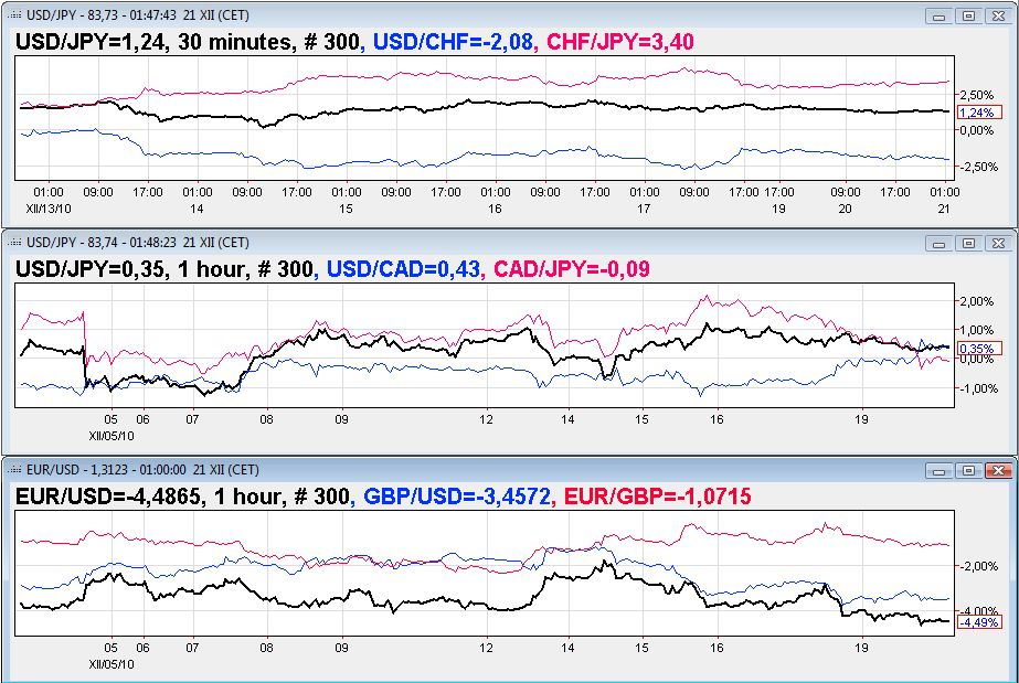 První pravidlo - kurzy měn vycházejí z křížové tabulky (uváděné i tady na blogu), tvořené násobky nebo podíly dílčích párů. Např. kurz páru eur/usd * kurz páru usd/jpy nám tvoří kurz páru eur/jpy. Naopak podíl usd/jpy / usd/chf nám udává kurz chf/jpy atd. atp.