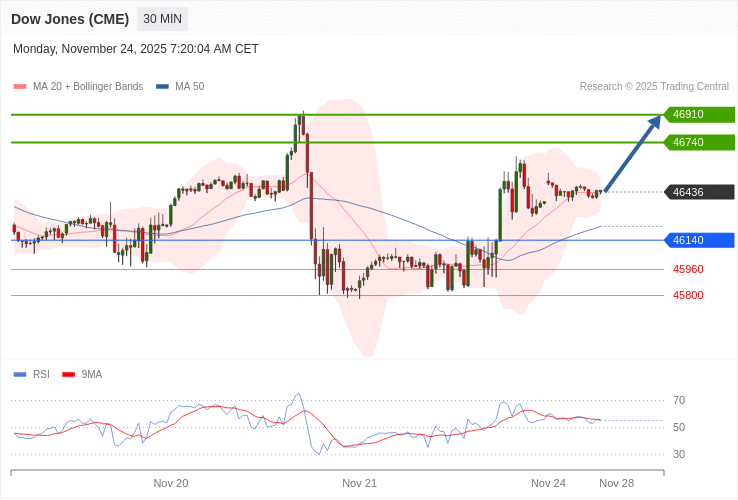 Klíčová slova: Intradenní výhled | Dow Jones | Indikátor | Long | Pozice | RSI | Rezistence | Trading | Pivot | Trading Central | Supporty a rezistence | Výhled | Pokles | Indikátor RSI | Dlouhé (long) pozice | Supporty |