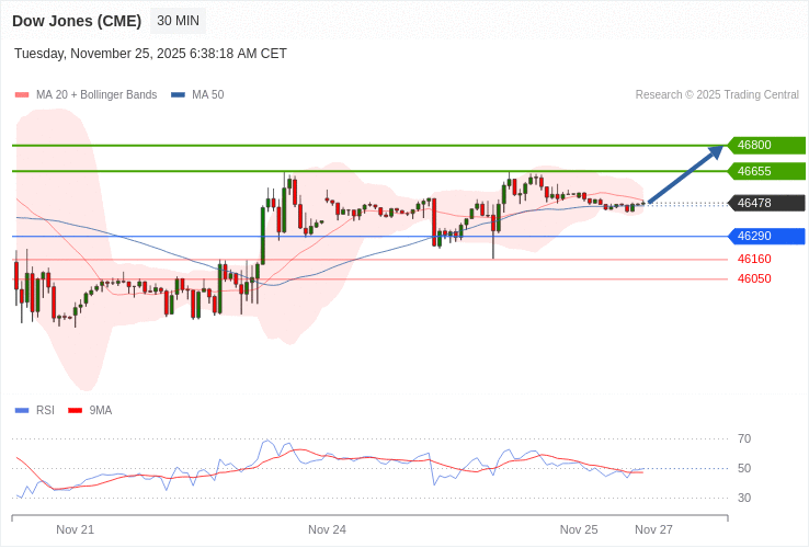 Klíčová slova: Intradenní výhled | Dow Jones | Konsolidace | Long | Pozice | Rezistence | Trading | Pivot | Trading Central | Supporty a rezistence | Výhled | Pokles | Dlouhé (long) pozice | Supporty |