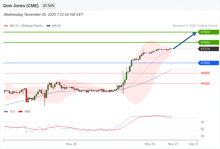 Klíčová slova: Intradenní výhled | Dow Jones | Indikátor | Long | Pozice | RSI | Rezistence | Trading | Pivot | Trading Central | Supporty a rezistence | Výhled | Pokles | Indikátor RSI | Další růst | Růst | Dlouhé (long) pozice | Supporty |