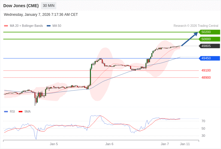 Klíčová slova: Intradenní výhled | Dow Jones | Long | Pozice | Rezistence | Trading | Pivot | Trading Central | Supporty a rezistence | Výhled | Pokles | Růst | Signál | Dlouhé (long) pozice | Průraz | Pozitivní signál | Supporty |