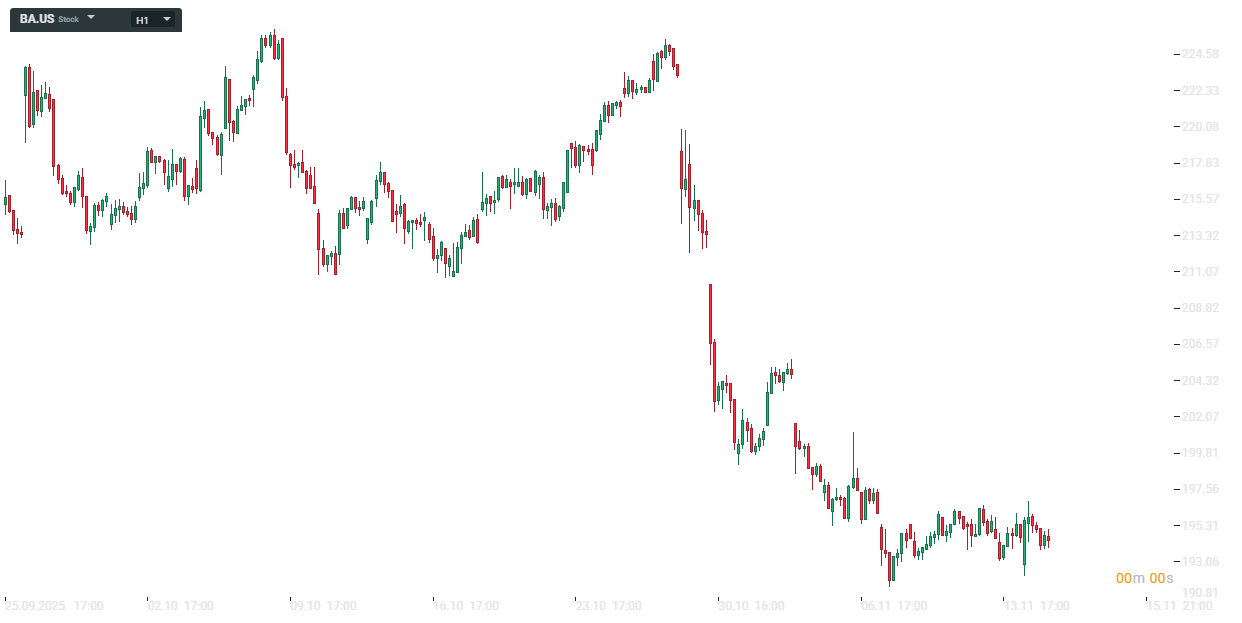 Vývoj ceny akcií Boeing (1hodinový graf – H1):