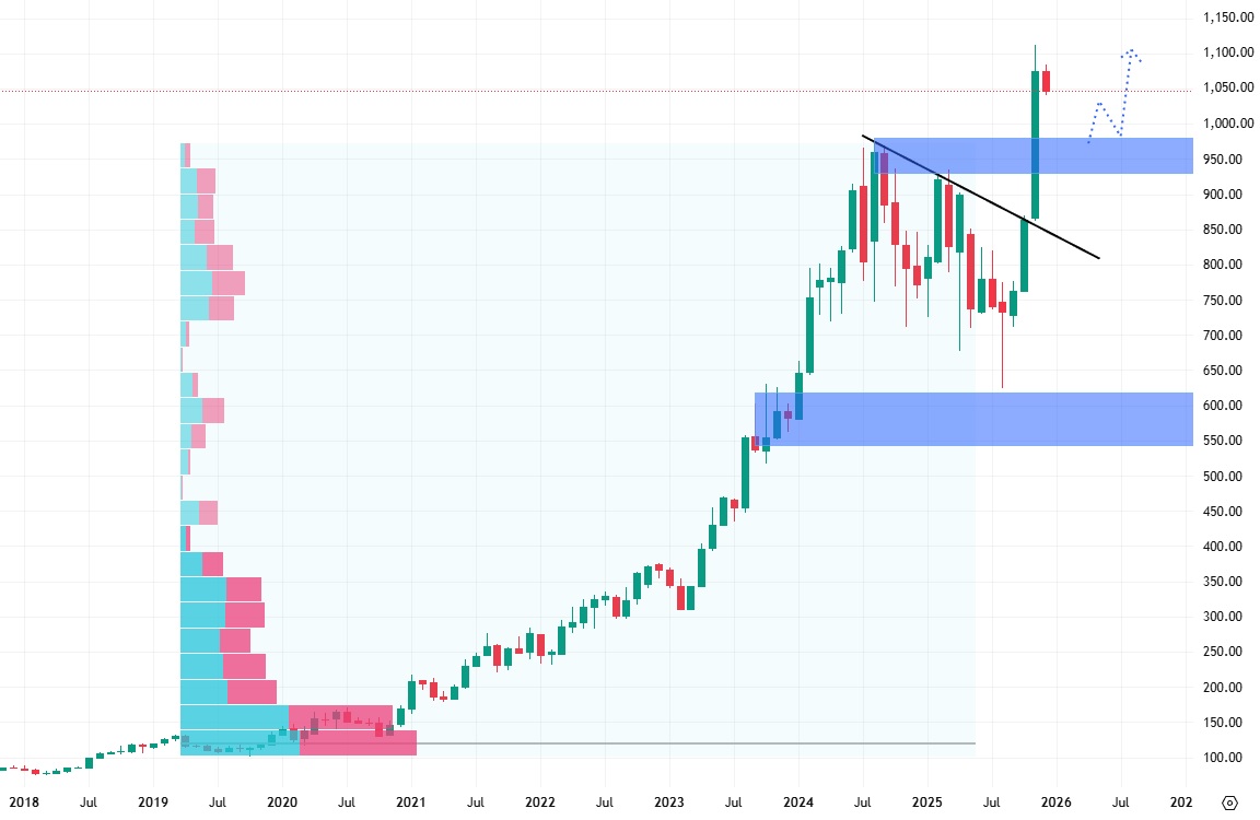 Akcie společnosti Eli Lilly se obchodují v dlouhodobém a poměrně agresivním cenovém růstu. Akciím se podařilo prorazit hodnotu klesající trendové čáry, pod kterou se delší dobu nacházely. Agresivita tohoto průrazu akciím také pomohla v tvorbě současných historických cenových maxim. Nejbližší support se nachází na ceně 900 USD a jedná se o proražené předchozí cenové maximum.