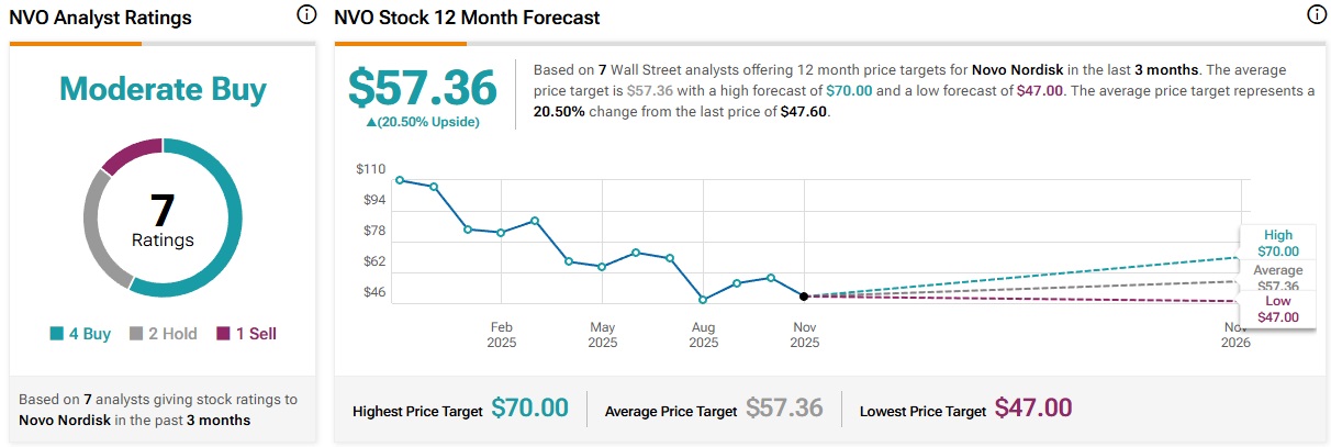(Cenová predikce pro akcie Novo Nordisk od analytiků z Wall Street Zdroj: tipranks.com)