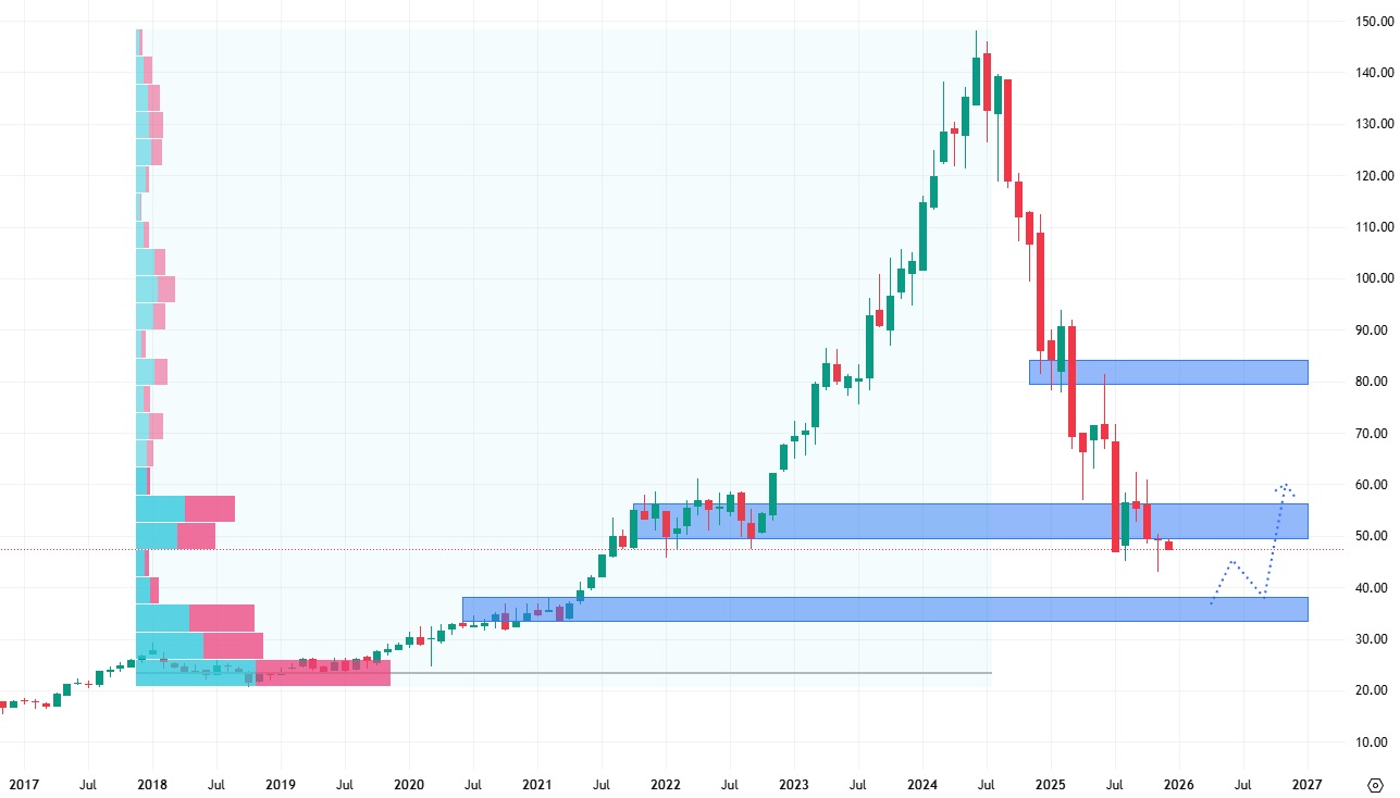 Akcie společnosti Novo Nordisk se obchodují v agresivním dlouhodobém trendu, přičemž již dokázaly smazat zisky ze svého cenového růstu mezi lety 2022-2024. Aktuálně to vypadá, že akcie proráží hodnotu předposledního supportu s možností cenového poklesu k 35 USD, kde se nachází menší support z roku 2020. Pokles akcií pod jeho hodnotu by už byl pro investory velmi nepříjemný.