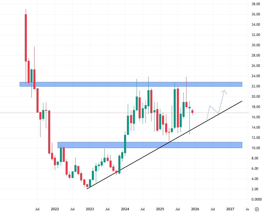 Akcie společnosti Oscar Health se obchodují nad hodnotou rostoucí trendové čáry s tím, že mají problém prorazit rezistentní zónu na ceně 22 USD za akcii. Tato rezistence navíc už několikrát odrazila nápor kupců. Akcie však mají stále tendenci tvořit vyšší minimální hodnoty, což je známka nákupního tlaku. Průraz akcií nad rezistenci by jim otevřel dveře k výraznému cenovému růstu.