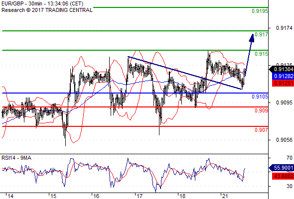 Alternativní scénář: Pod 0,9105 je pravděpodobný pokles na 0,9090 a dále pak až na 0,9070.