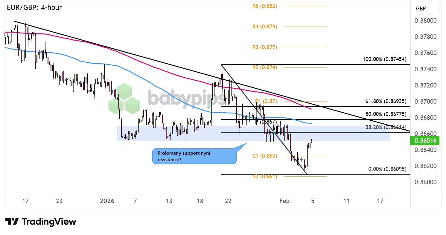 EUR/GBP se přiblížil do konfluenční oblasti, čeká nás pullback?