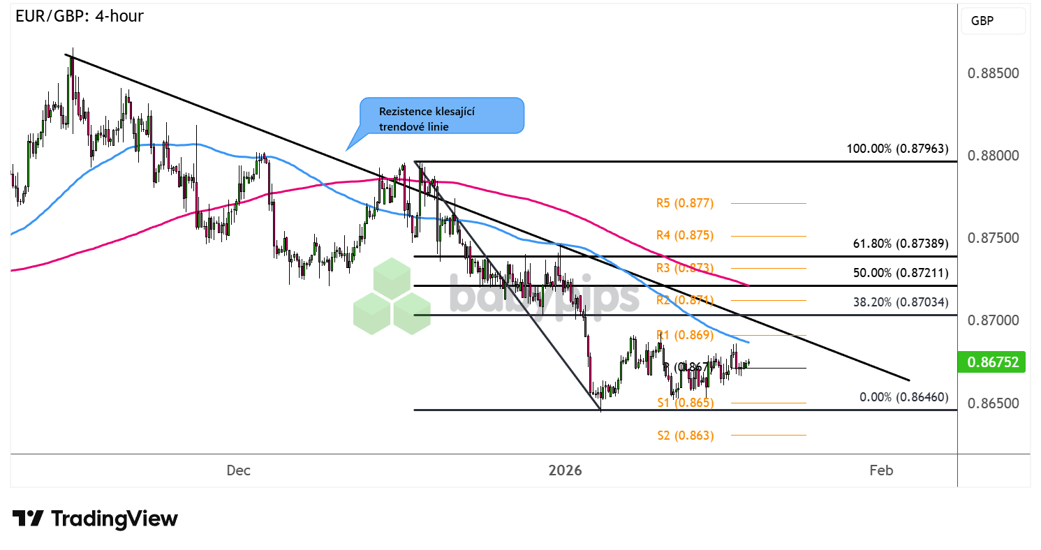 EUR/GBP se přibližuje k rezistenci klesající trendové linie, čeká nás další pokles nebo změna trendu?