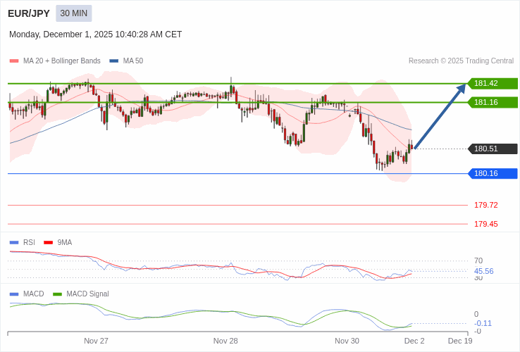 Preferovaný scénář: Dlouhé (long) pozice nad 180,16 s cílem na 181,16 a dále pak až na 181,42.