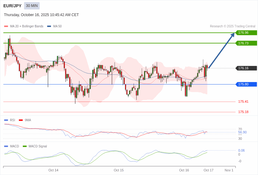 Preferovaný scénář: Dlouhé (long) pozice nad 175,80 s cílem na 176,73 a dále pak až na 176,96.