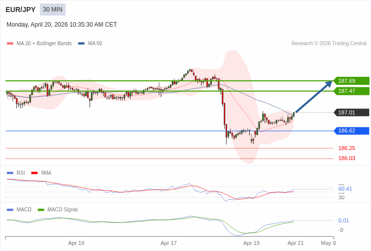 Preferovaný scénář: Dlouhé (long) pozice nad 186,62 s cílem na 187,47 a dále pak až na 187,69.