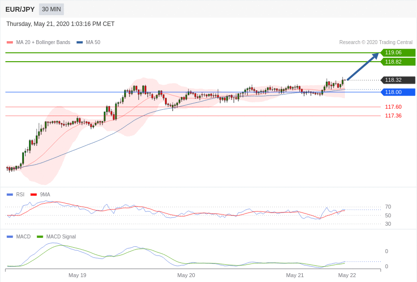 Preferovaný scénář: Dlouhé (long) pozice nad 118,00 s cílem na 118,82 a dále pak až na 119,06.
