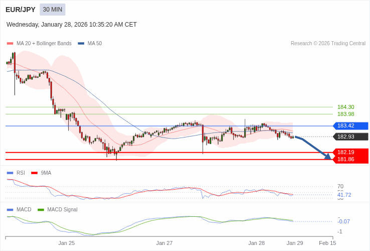 Preferovaný scénář: Krátké (short) pozice pod 183,42 s cílem na 182,19 a dále pak až na 181,86.