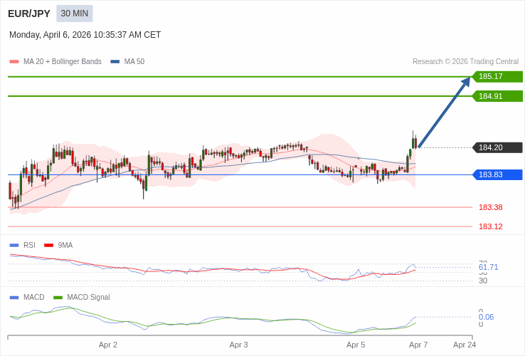 Preferovaný scénář: Dlouhé (long) pozice nad 183,83 s cílem na 184,91 a dále pak až na 185,17.