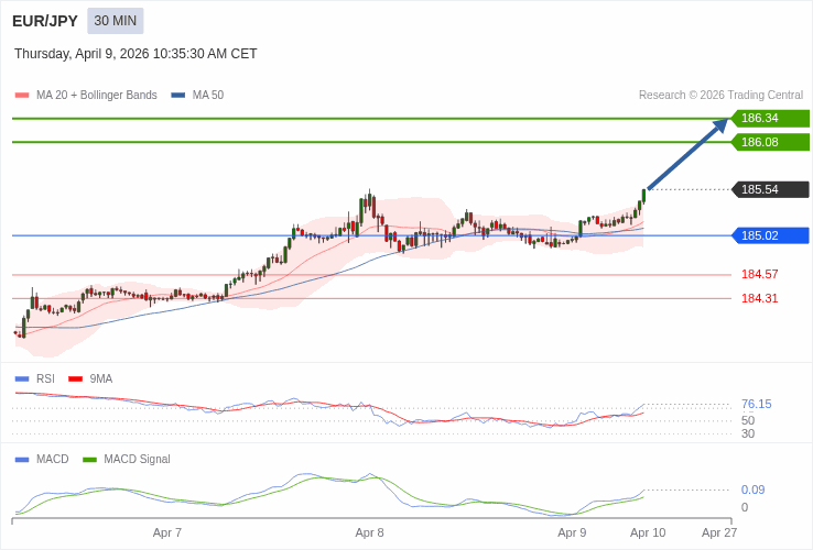 Preferovaný scénář: Dlouhé (long) pozice nad 185,02 s cílem na 186,08 a dále pak až na 186,34.