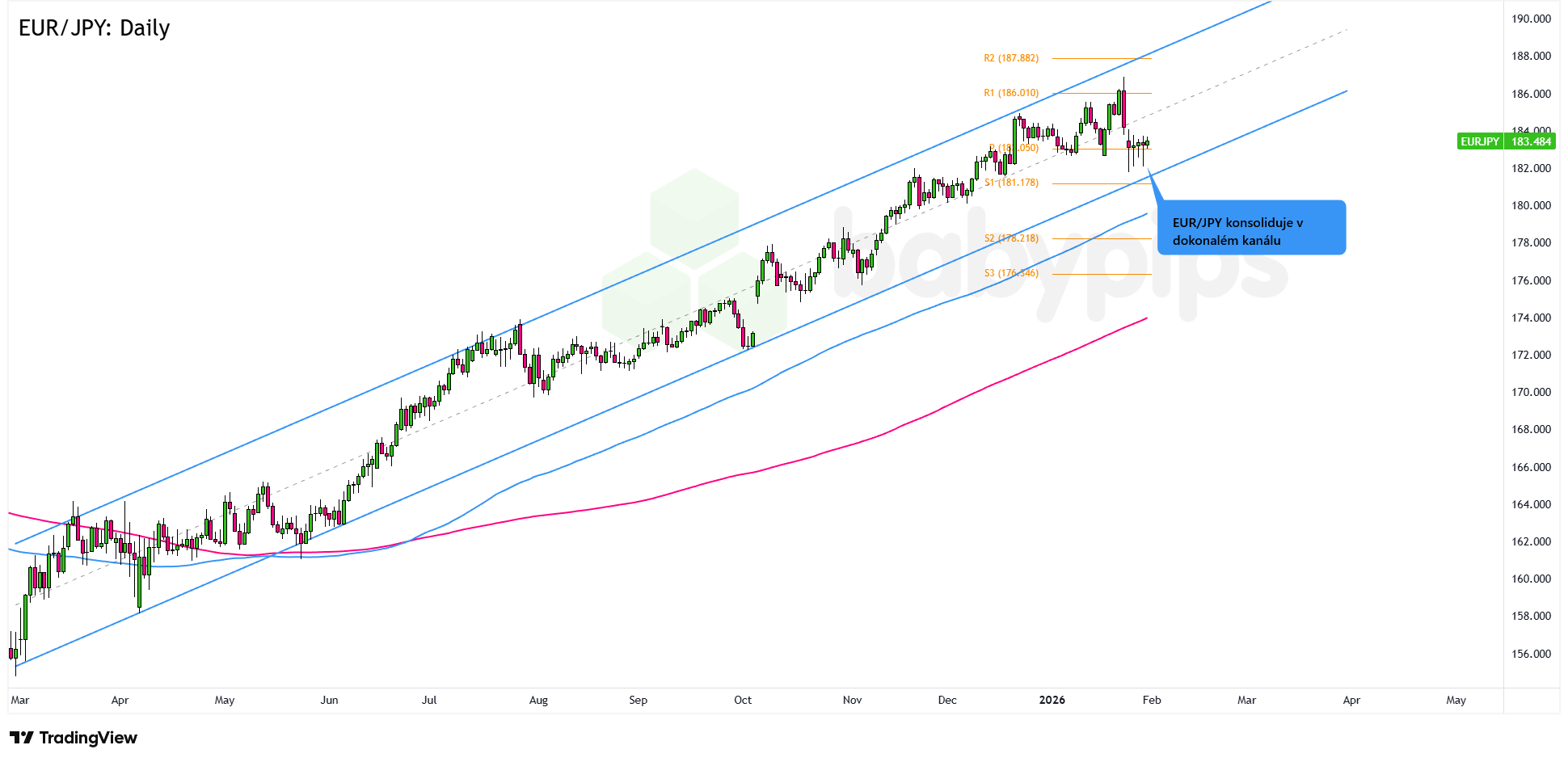 Měnový pár EUR/JPY se na denním grafu momentálně přibližuje k supportu trendového kanálu kolem psychologické hladiny 182,00, který zároveň koresponduje s úrovní standartního Pivot Pointu S1. Dočkáme se odražení směrem vzhůru a bude pokračovat rostoucí trend? Nebo naopak k prolomení zmíněného supportu s možnou změnou trendu?