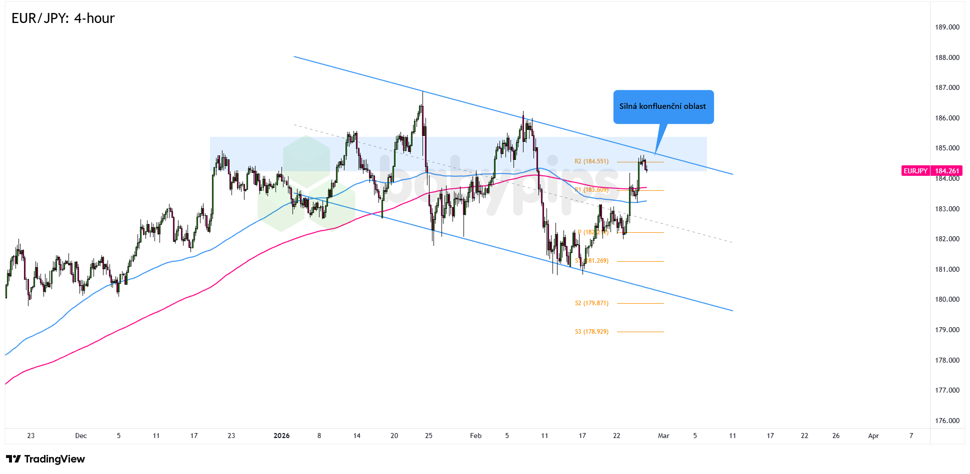 Měnový pár EUR/JPY se na 4hodinovém grafu obchoduje v klesajícím trendovém kanálu a nyní se odráží směrem dolů od jeho rezistence kolem hladiny 184,50, která zároveň koresponduje s úrovní standartního Pivot Pointu R2 a také s vyznačenou S/R zónou. Dochází zde k odrazu a bude pokračovat klesající trend? Nebo kolem současných úrovní najdou znovu sílu býci a dojde k prolomení zmíněné konfluenční oblasti s možnou změnou krátkodobého trendu?
