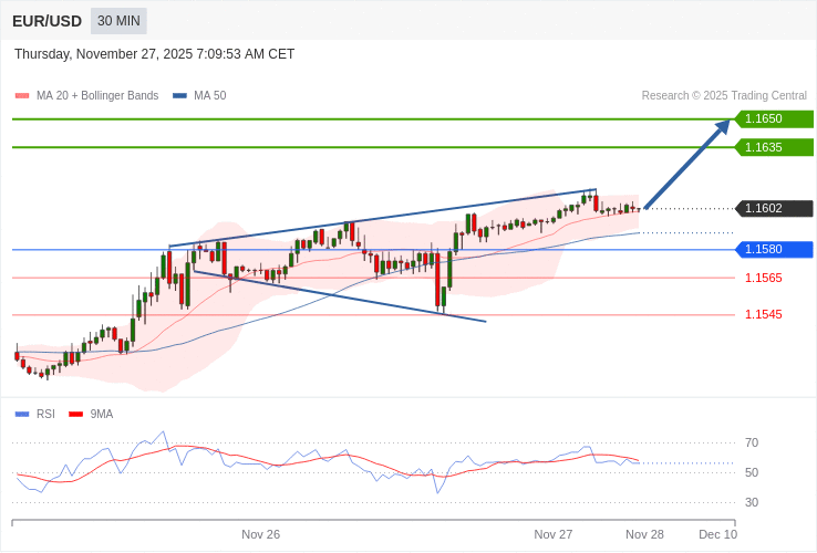 Preferovaný scénář: Dlouhé (long) pozice nad 1,1580 s cílem na 1,1635 a dále pak až na 1,1650.