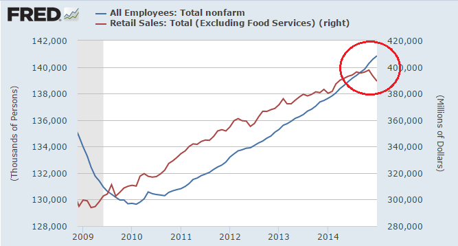 Porovnání vývoje zaměstnanosti (modře, levá osa) a maloobchodních tržeb (červeně pravá osa) v USA: