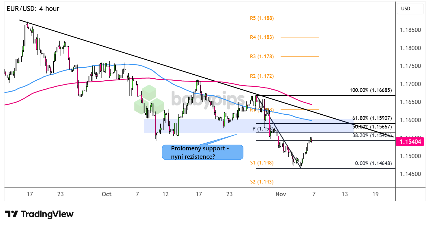 Měnový pár EUR/USD na 4hodinovém grafu aktuálně přiblížil k již dříve prolomené oblasti supportu (pullback - nyní rezistence) kolem psychologické hladiny 1,1550, která zároveň koresponduje s úrovní 50 % Fibonacciho retracementu a také s klouzavým průměrem SMA 100. Dočkáme se nyní odrazu pullback a otestování posledních swingových minim?