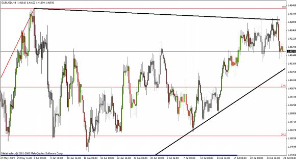 Cenová akce na tomto trhu ukazuje, že se trh dostal na svůj support k trendové čáře 1.4000. Po možném breakoutu této trendové čáry by se trh mohl velmi rychle dostat až k 1.3850, kde je velmi silný support. -
