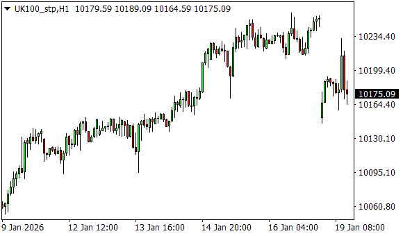 Vývoj akciového indexu FTSE 100 (1hodinový graf - H1):