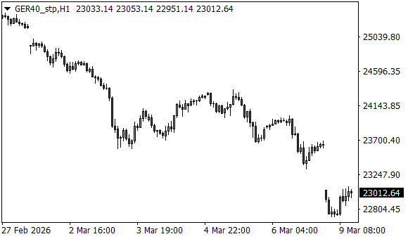Vývoj akciového indexu DAX (1hodinový graf - H1):