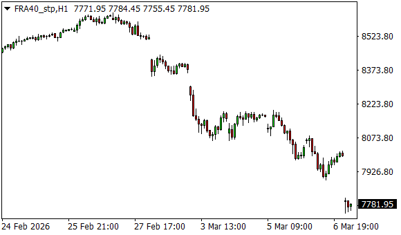 Vývoj akciového indexu CAC 40 (1hodinový graf - H1):
