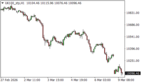 Vývoj akciového indexu FTSE 100 (1hodinový graf - H1):