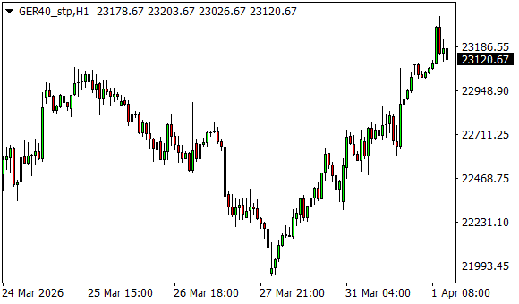 Vývoj akciového indexu DAX (1hodinový graf - H1):