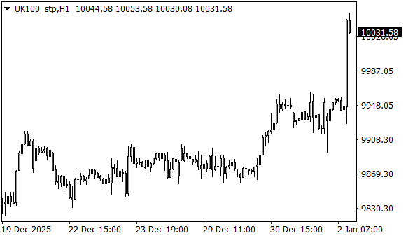 Vývoj akciového indexu FTSE 100 (1hodinový graf - H1):