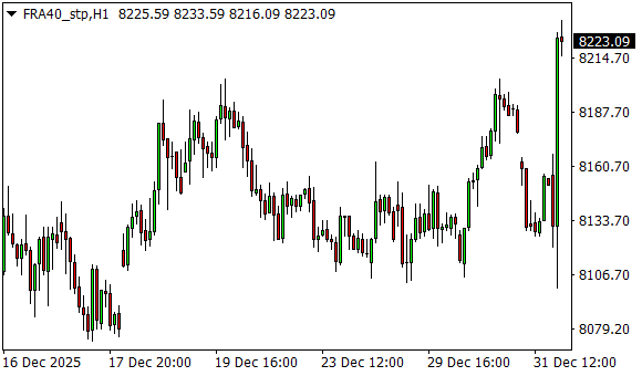 Vývoj akciového indexu CAC 40 (1hodinový graf - H1):