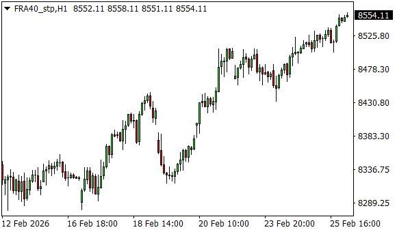 Vývoj akciového indexu CAC 40 (1hodinový graf - H1):