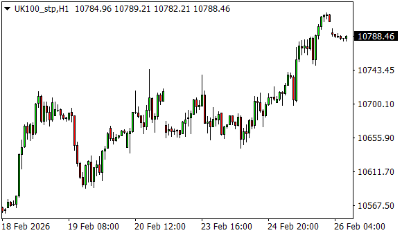 Vývoj akciového indexu FTSE 100 (1hodinový graf - H1):