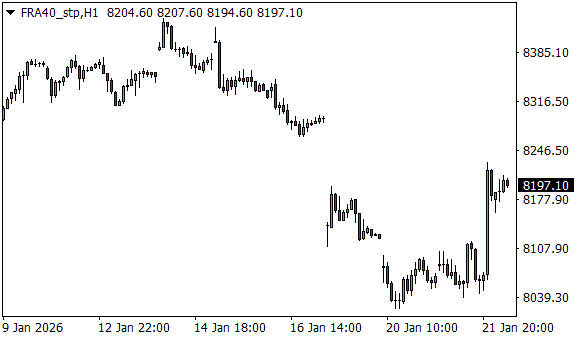 Vývoj akciového indexu CAC 40 (1hodinový graf - H1):