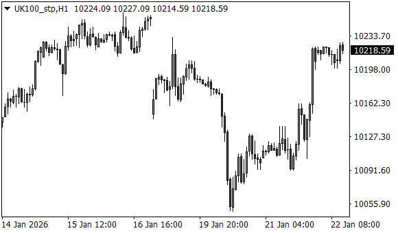 Vývoj akciového indexu FTSE 100 (1hodinový graf - H1):