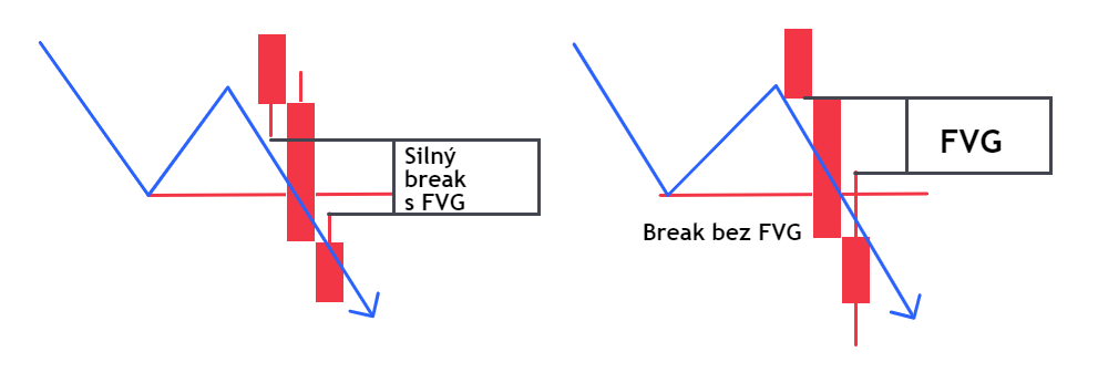 Pokud k breaku dojde tak, že linie breaku není uvnitř gapu, tak je situace, že gap zafunguje jako support (rostoucí trend), nebo rezistence (klesající trend), méně spolehlivá. Příklad silného breaku s FVG a méně spolehlivého breaku bez FVG v býčím trendu máme na dalším obrázku.