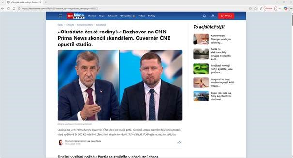 Reportáž je umístěna na podvodné internetové stránce, která propaguje investice na platformě Záře Finthor/„Zare Phintor“. Stránka umístěná na webu factoriatime[.]com funguje jako tzv. maskovací-přesměrovací stránka napodobující vizuál zpravodajského webu CNN Prima NEWS a je na ní uveřejněn údajný přepis z pořadu Partie, ve kterém je zneužito jméno a také podoba guvernéra České národní banky a premiéra České republiky.