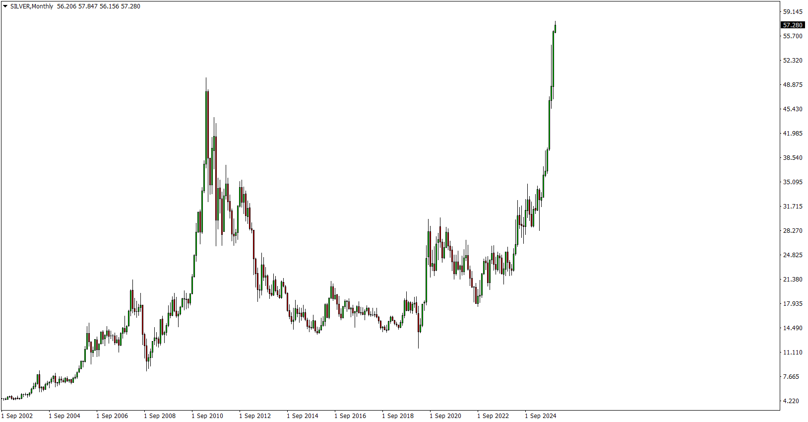 Vývoj ceny stříbra v USD (měsíční časový ráme):