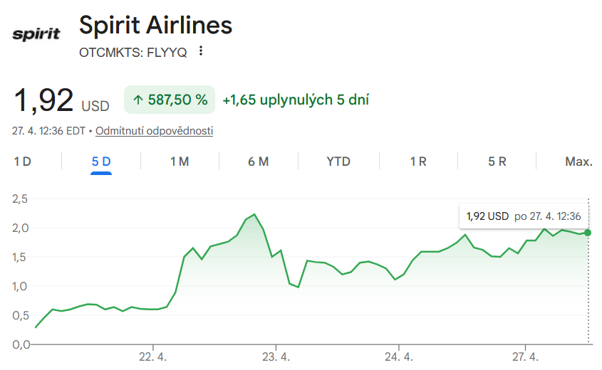 I když Trumpův nápad kritizují i mnozí zákonodárci, na burze sehrál roli živé vody. Akcie Spirit Airlines stála před týdnem sotva 30 centů, dnes stojí přes 1,5 dolaru a chvíli měla hodnotu přes dva dolary. Takže nárůst ve stovkách procent, potenciální insider z Bílého domu by se tady pěkně „napakoval“.