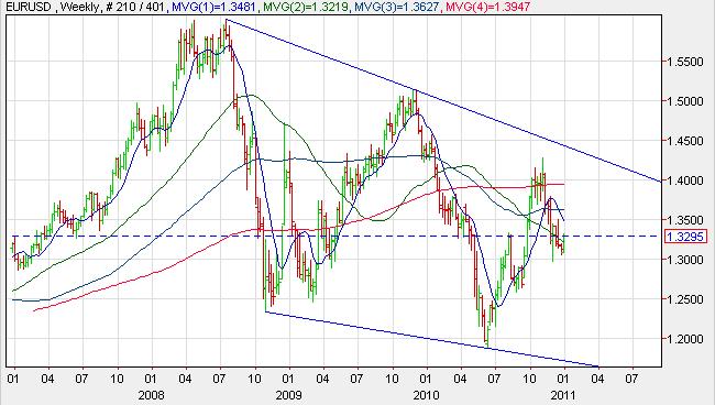 I přes všechny současné problémy se rozpad eurozóny (zatím!) jeví jako málo pravděpodobný. Politická vůle udržet eurozónu pohromadě je stále dostatečně vysoká na to, aby udržela tento neuvěřitelně náročný a drahý projekt naživu. Evropská Centrální Banka disponuje opatřeními (nákupy dluhopisů periferních států EU, zvětšení Evropského Fondu Finanční Stability, zvýšení finanční pomoci za asistence MMF, potvrzení dostupnosti finančních prostředků v nouzové situaci apod.), které může použít nejen pro stabilizaci evropského dluhopisového trhu. Stabilizace dluhopisů by následně vedla ke stabilizaci pádu eura a možnému korektivnímu posilování. Korektivnímu proto, že výše zadlužení a snižování ratingu zemí eurozóny spolu s varováním o dalším možném snížení zůstane na paměti traderů a zamezí tak přílišnému posilování. Celkový výhled je slabě negativní. Pásmo pro 2011: 1.3750 - 1.2500