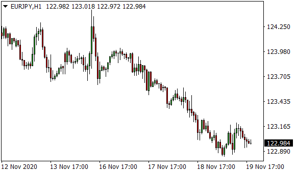 Vývoj měnového páru EUR/JPY (1hodinový graf – H1):