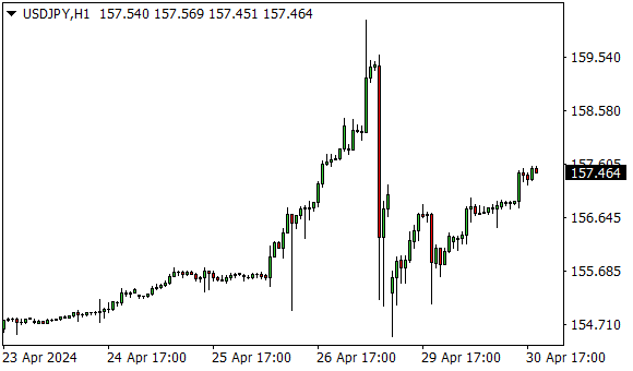 Japonský jen v pondělí výrazně posílil vůči dolaru poté, co se dotkl nového 34letého minima 160,24 USD/JPY. Podle obchodníků růst jenu způsobily intervence japonských úřadů na podporu domácí měny. Podle dnešních údajů japonské centrální banky mohla země v pondělí vynaložit na podporu měny přibližně 5,5 bilionu jenů (822 miliard Kč).