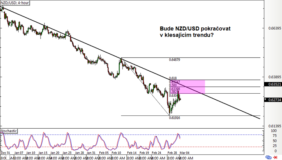 Měnový pár NZD/USD se na 4hodinovém grafu obchoduje v klesajícím trendu a po odražení od vyznačené S/R zóny (nyní rezistence) směrem dolů, pokračuje v poklesu. Tato oblast zároveň koresponduje s úrovněmi Fibonacciho retracementu. Indikátor Stochastic současně již opustil překoupenou oblast, a tak by sestupný trend mohl pokračovat. Uvidíme tento scénář?