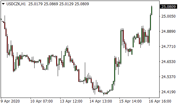 Vývoj měnového páru USD/CZK (1hodinový graf - H1):